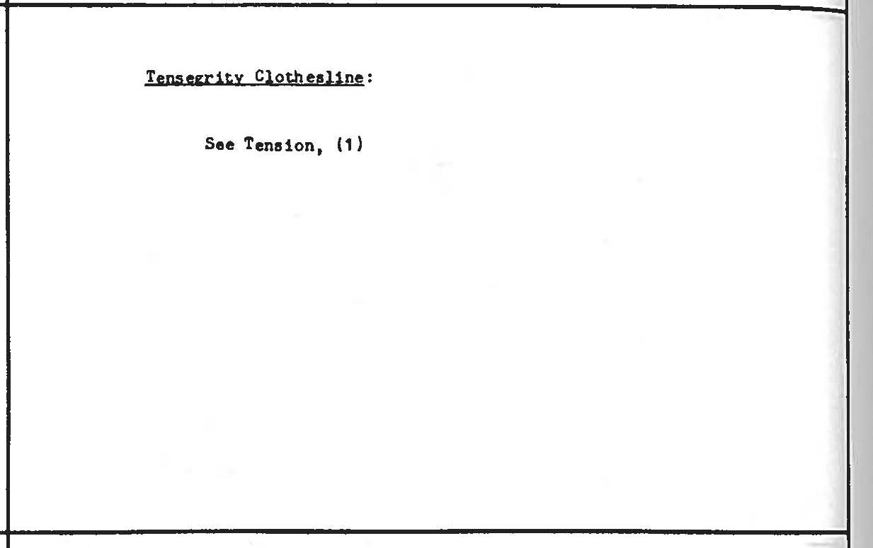 Tensegrity card No. 17968 from the Synergetics Dictionary, (c) 1986, 2008, The Estate of R. Buckminster Fuller & The Estate of E.J. Applewhite. All Rights Reserved. Copy or download of this copyrighted work is permitted for personal non-commercial use only. Link to this card: http://www.rwgrayprojects.com/SynergeticsDictionary/SDCards.php?cn=17968&tp=1. The entire dictionary is accessible online at http://www.rwgrayprojects.com/SynergeticsDictionary/SD.html.