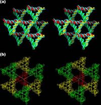 A 3 strut tensegrity has been constructed from DNA strands by Seeman's team. Below, a stereoscopic image.