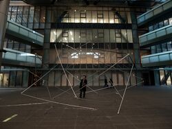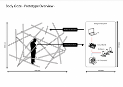 A 21 strut tensegrity with a computer-driven air compressor, pneumatic valves and human-activity-tuned sensors was deployed by Yosuke Ushigome, a masters student in Informational Science and Technology at the University of Tokyo. He named it Archi/e Machina. In his words, it is a large tensegrity-based structure with sensors that activate changing tension members in its tendon net. The hardware of Archi/e Machina can be divided into a sensing device and a spatial structure. The sensing device in the prototypes were either microphones or six infrared sensors. The spatial structure, based on tensegrity, was composed of aluminum pipe and steel wire. Pneumatic devices were used to dynamically modify the structure. Its software consists of PC programs such as Max/MSP patches, that can input the sensor data and actuate the pneumatic devices. The size of one prototype was 5m x 5m x 4m (WxDxH) for spatial structure and 1m x 1m x 1m for its background system.