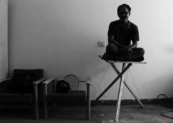 Sushant Passi seated on his 3 strut tensegrity stool. Behance, 2013.