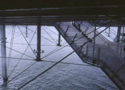 The Blur Building was a media pavilion built for Swiss Expo 2002 at the base of Lake Neuchatel in Yverdon-les-Bains, Switzerland. From piles in the water, a system of rectilinear struts and diagonal rods cantilevers out over the lake. Ramps and walkways weave through the system, some of them providing a counterweight for the structure. "It was an exhibition pavilion with nothing on display, except for our cultural dependency on vision," said Diller.