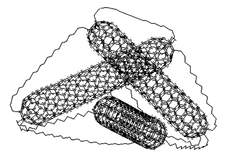 Three carbon nanotubes are covalently tensioned, or tethered, at their cap pentagons by polyethylene polymer chains, by Needham, Wilson, and Yakobson.