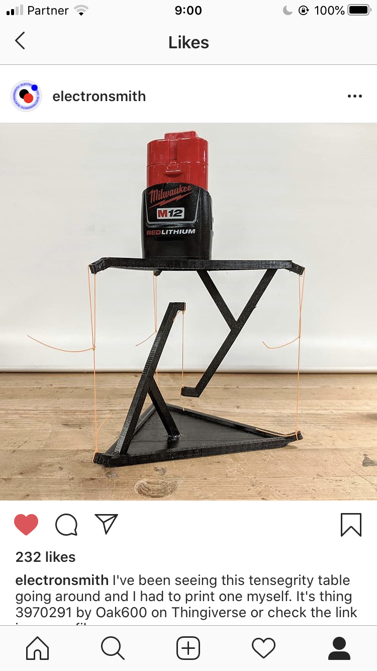 A tensegrity construction made during the 2020 COVID-19 quarantine period. The photo is a screenshot from instagram. The account is in the filename: e.g. 3dprint-by-account.PNG "account" is the name of the account.