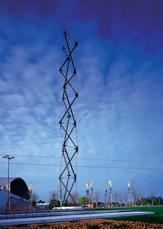 Warnow Tower, side view. The silver needle on top is barely visible. The wires in the distance are a cable car.Warnow Tower, side view. The silver needle on top is barely visible. The wires in the distance are a cable car.