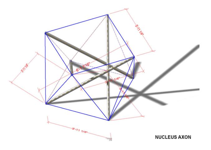 4 strut nucleus of an outdoor display unit. The blue tension members are shown at strut ends, but they are implemented mid-strut. Design and rendering by Raffi Tomassian.