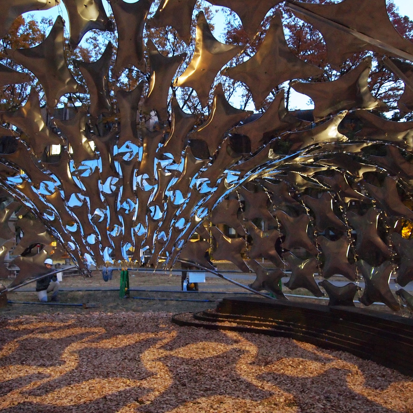 X-shaped shadows cast by the sun. 99 Failures Pavilion by U of Tokyo DFL. 99 Failures Pavilion by University of Tokyo