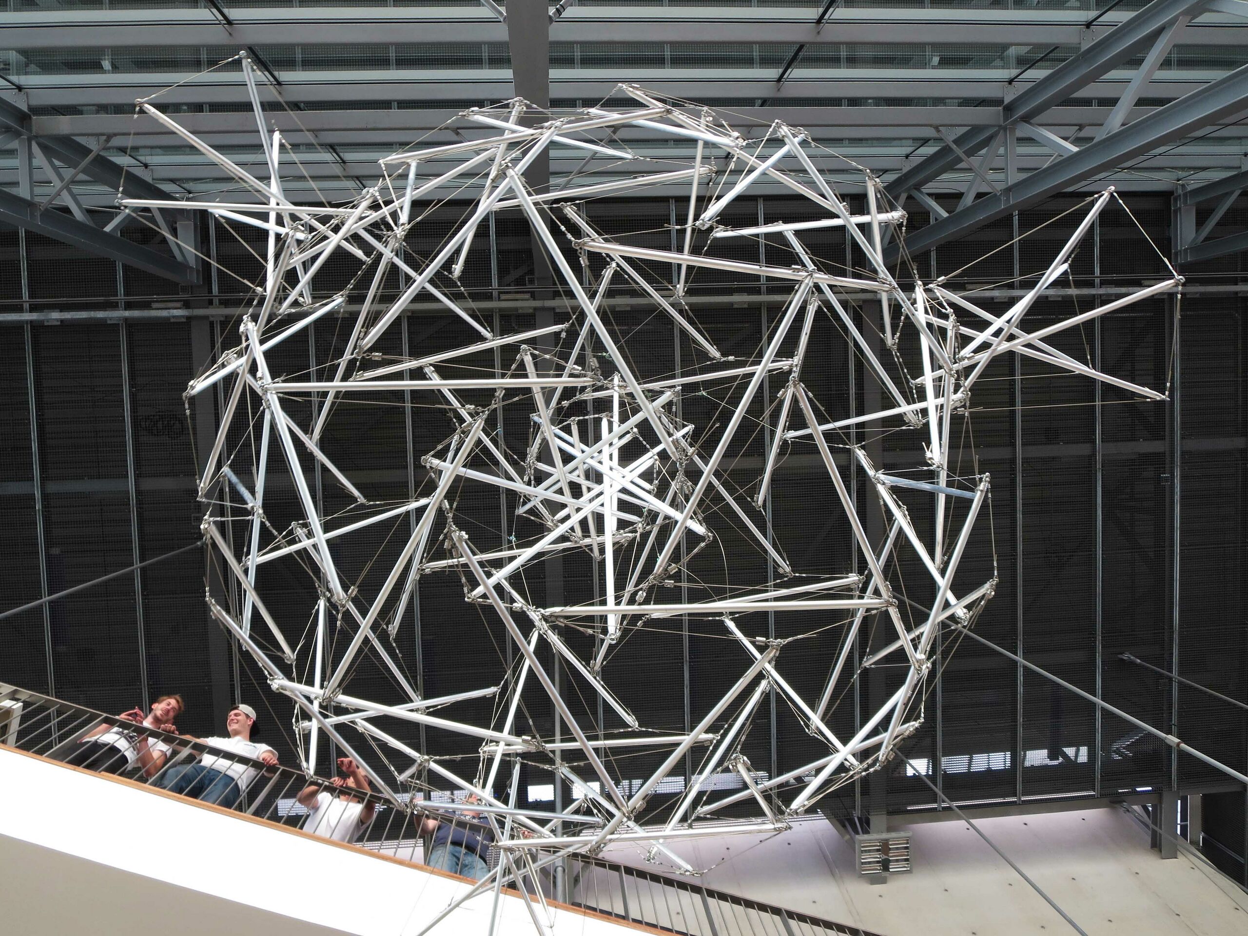 Tensegrity Goes BLOB sculpture hanging at IASS 2015, view from beneath. Photo by Bernhard Sill.