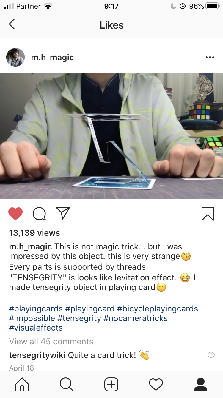 A tensegrity construction made during the 2020 COVID-19 quarantine period. The photo is a screenshot from instagram. The account is the first words of the filename, up to the hyphen, "-2020TensegrityChallenge". Example: my.account-2020TensegrityChallenge.PNG "my.account" is the name of the Instagram user's account where the photo was found.