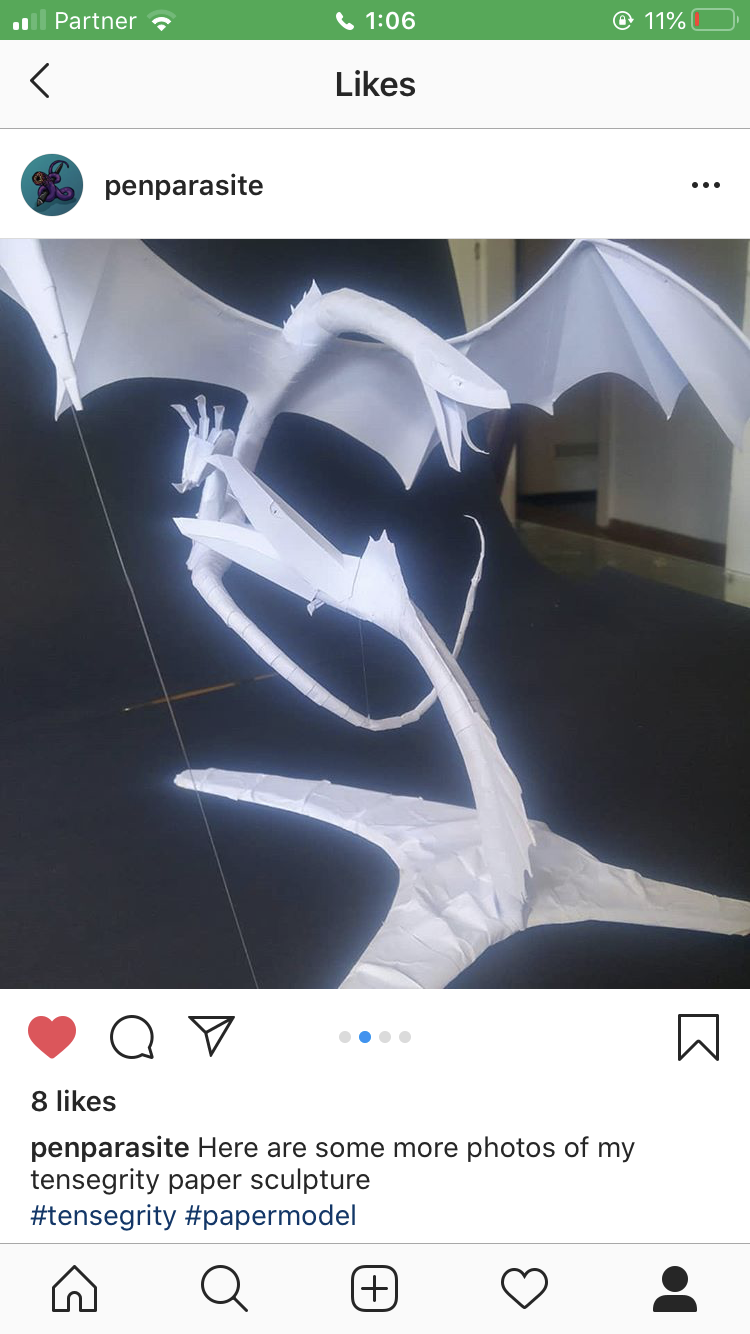 A tensegrity construction made during the 2020 COVID-19 quarantine period. The photo is a screenshot from instagram. The account is the first words of the filename, up to the hyphen, "-2020TensegrityChallenge". Example: my.account-2020TensegrityChallenge.PNG "my.account" is the name of the Instagram user's account where the photo was found.