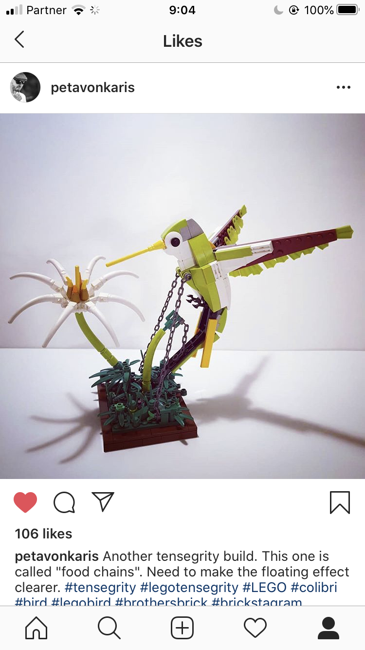 A tensegrity construction made during the 2020 COVID-19 quarantine period. The photo is a screenshot from instagram. The account is the first words of the filename, up to the hyphen, "-2020TensegrityChallenge". Example: my.account-2020TensegrityChallenge.PNG "my.account" is the name of the Instagram user's account where the photo was found.