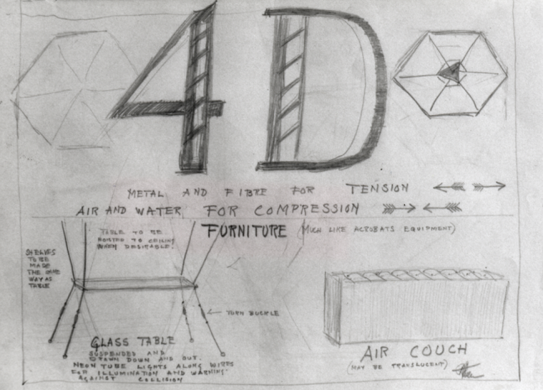4D Furniture Rendering in Pencil by Fuller, 1928. From Becoming Bucky Fuller by Lorance, p74 Fig3.1