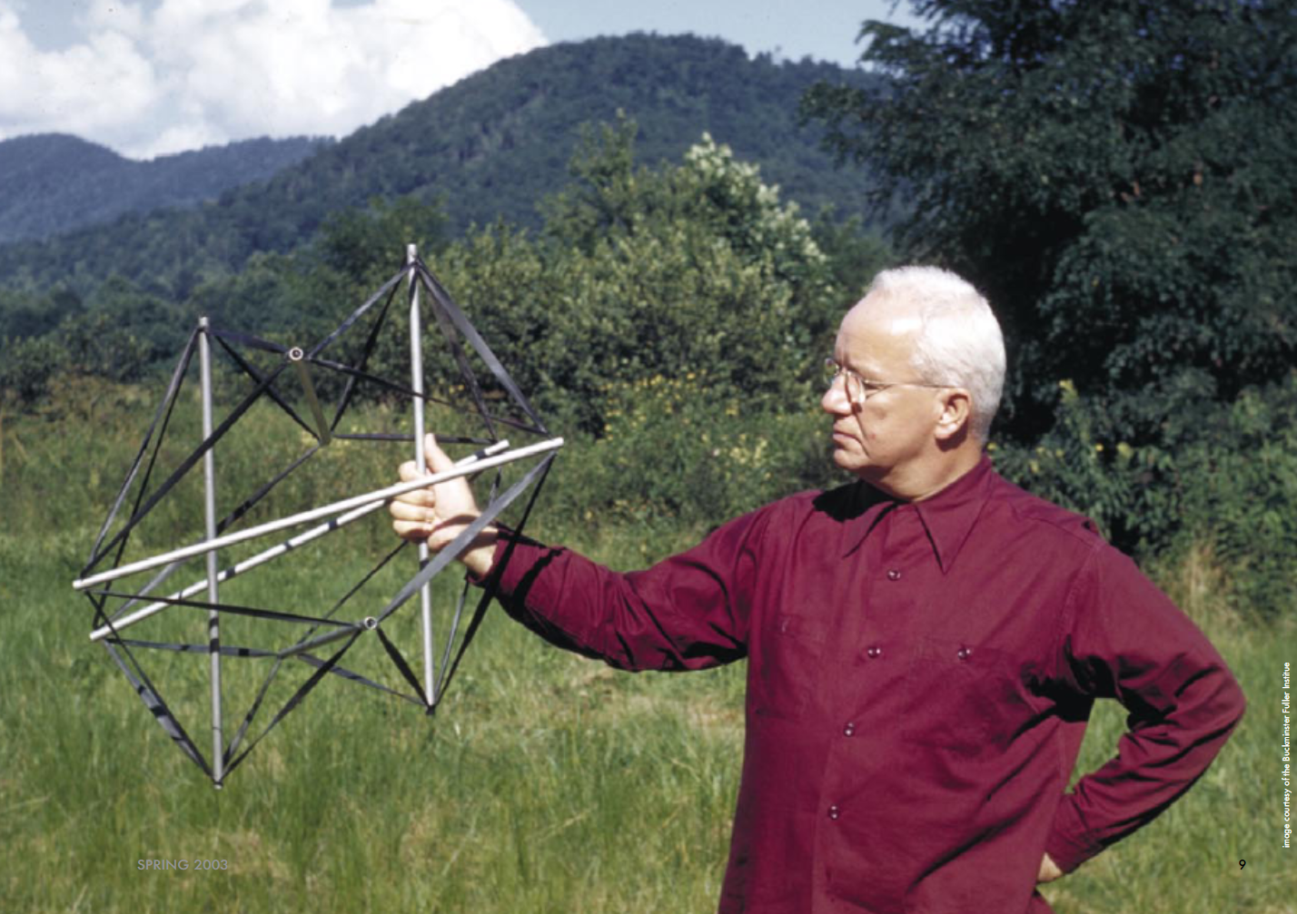 Richard Buckminster Fuller holding a 6 strut tensegrity. Probably Black Mountain, 1949. Courtesy of the BUckminster Fuller Institute.