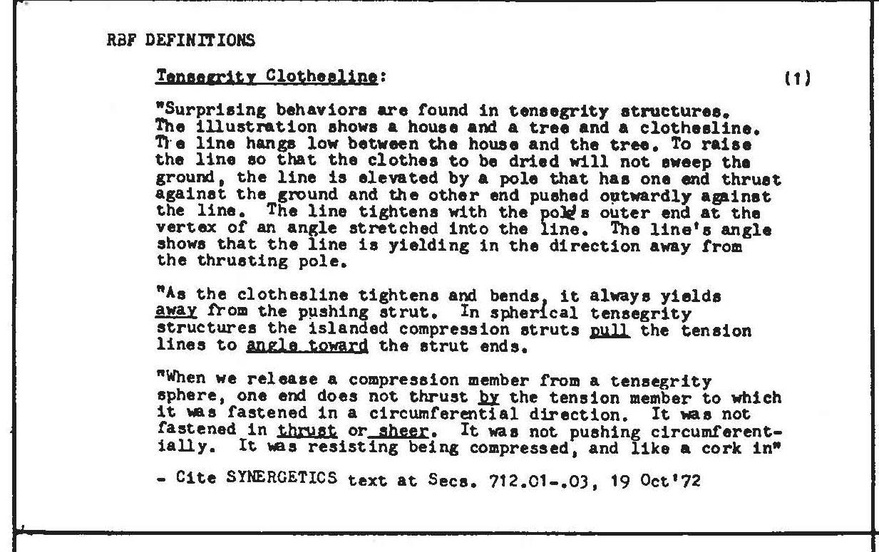 Tensegrity card No. 17965 from the Synergetics Dictionary, (c) 1986, 2008, The Estate of R. Buckminster Fuller & The Estate of E.J. Applewhite. All Rights Reserved. Copy or download of this copyrighted work is permitted for personal non-commercial use only. Link to this card: http://www.rwgrayprojects.com/SynergeticsDictionary/SDCards.php?cn=17965&tp=1. The entire dictionary is accessible online at http://www.rwgrayprojects.com/SynergeticsDictionary/SD.html.