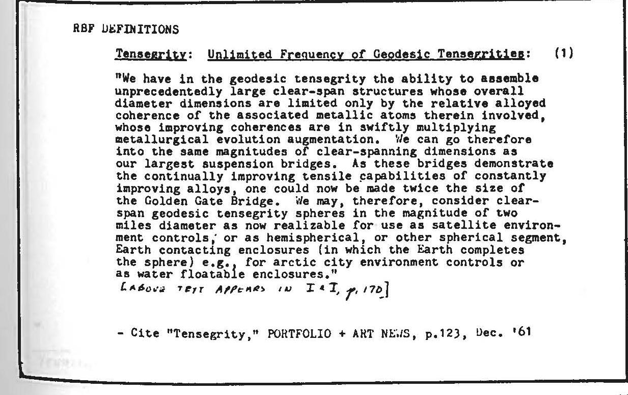 Tensegrity card No. 17974 from the Synergetics Dictionary, (c) 1986, 2008, The Estate of R. Buckminster Fuller & The Estate of E.J. Applewhite. All Rights Reserved. Copy or download of this copyrighted work is permitted for personal non-commercial use only. Link to this card: http://www.rwgrayprojects.com/SynergeticsDictionary/SDCards.php?cn=17974&tp=1. The entire dictionary is accessible online at http://www.rwgrayprojects.com/SynergeticsDictionary/SD.html.