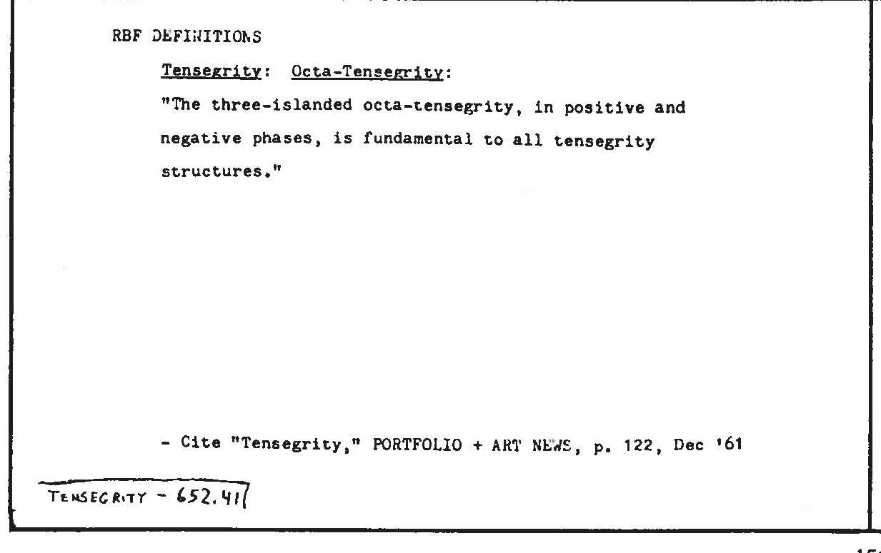 Tensegrity card No. 17998 from the Synergetics Dictionary, (c) 1986, 2008, The Estate of R. Buckminster Fuller & The Estate of E.J. Applewhite. All Rights Reserved. Copy or download of this copyrighted work is permitted for personal non-commercial use only. Link to this card: http://www.rwgrayprojects.com/SynergeticsDictionary/SDCards.php?cn=17998&tp=1. The entire dictionary is accessible online at http://www.rwgrayprojects.com/SynergeticsDictionary/SD.html.