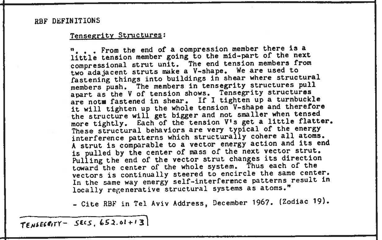 Tensegrity card No. 18009 from the Synergetics Dictionary, (c) 1986, 2008, The Estate of R. Buckminster Fuller & The Estate of E.J. Applewhite. All Rights Reserved. Copy or download of this copyrighted work is permitted for personal non-commercial use only. Link to this card: http://www.rwgrayprojects.com/SynergeticsDictionary/SDCards.php?cn=18009&tp=1. The entire dictionary is accessible online at http://www.rwgrayprojects.com/SynergeticsDictionary/SD.html.