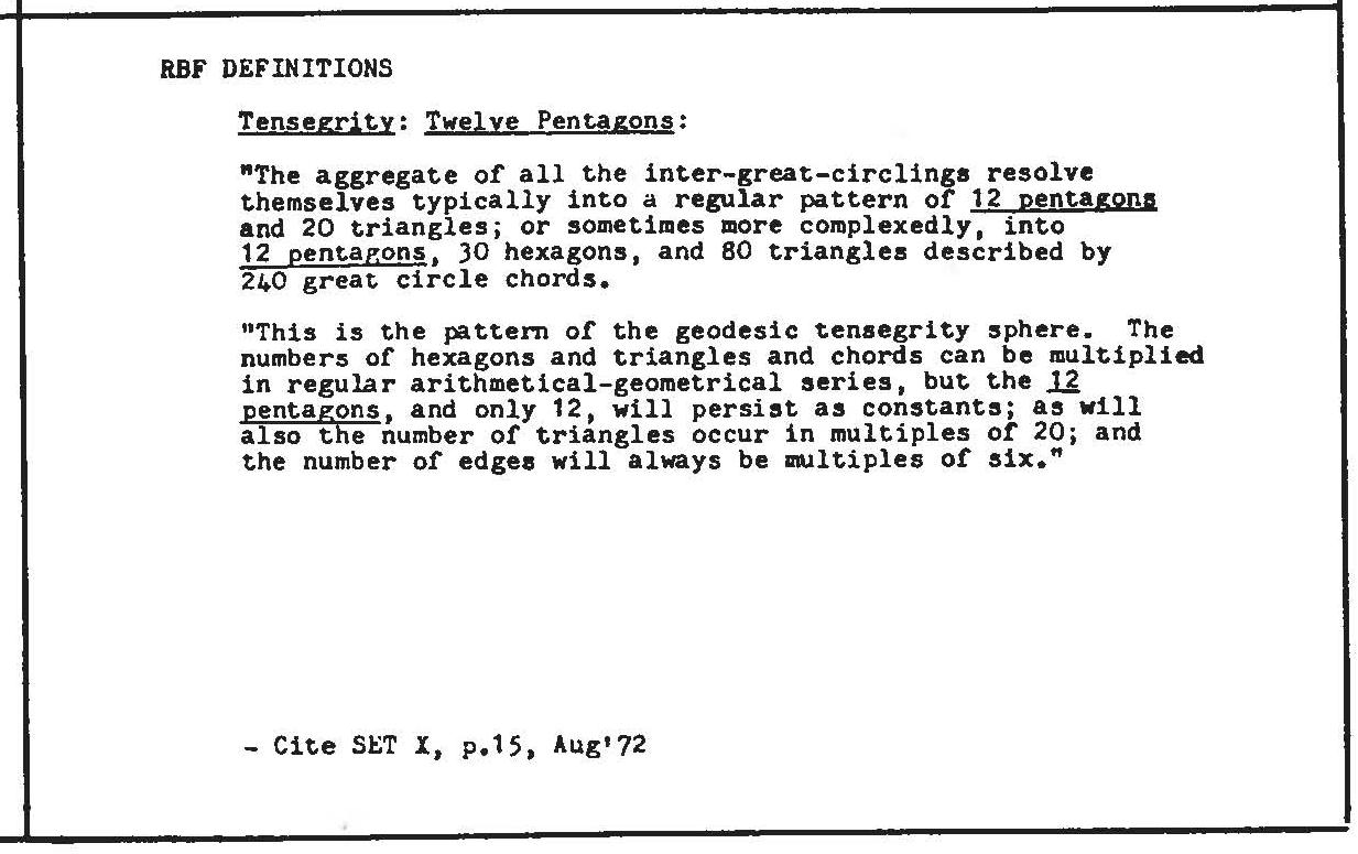 Tensegrity card No. 18010 from the Synergetics Dictionary, (c) 1986, 2008, The Estate of R. Buckminster Fuller & The Estate of E.J. Applewhite. All Rights Reserved. Copy or download of this copyrighted work is permitted for personal non-commercial use only. Link to this card: http://www.rwgrayprojects.com/SynergeticsDictionary/SDCards.php?cn=18010&tp=1. The entire dictionary is accessible online at http://www.rwgrayprojects.com/SynergeticsDictionary/SD.html.
