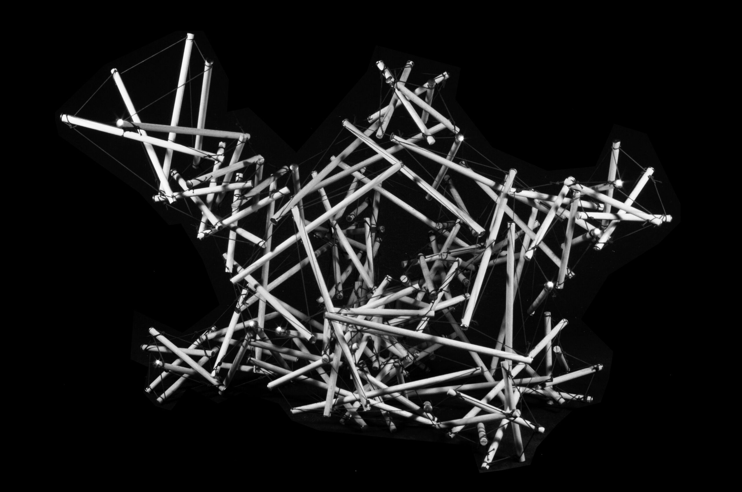 Working model of Tensegrity Goes BLOB sculpture, black and white.