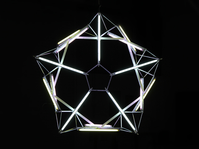 20 strut tensegrity formed from fluorescent tubes and wire. Side view. By James Clar. http://www.jamesclar.com