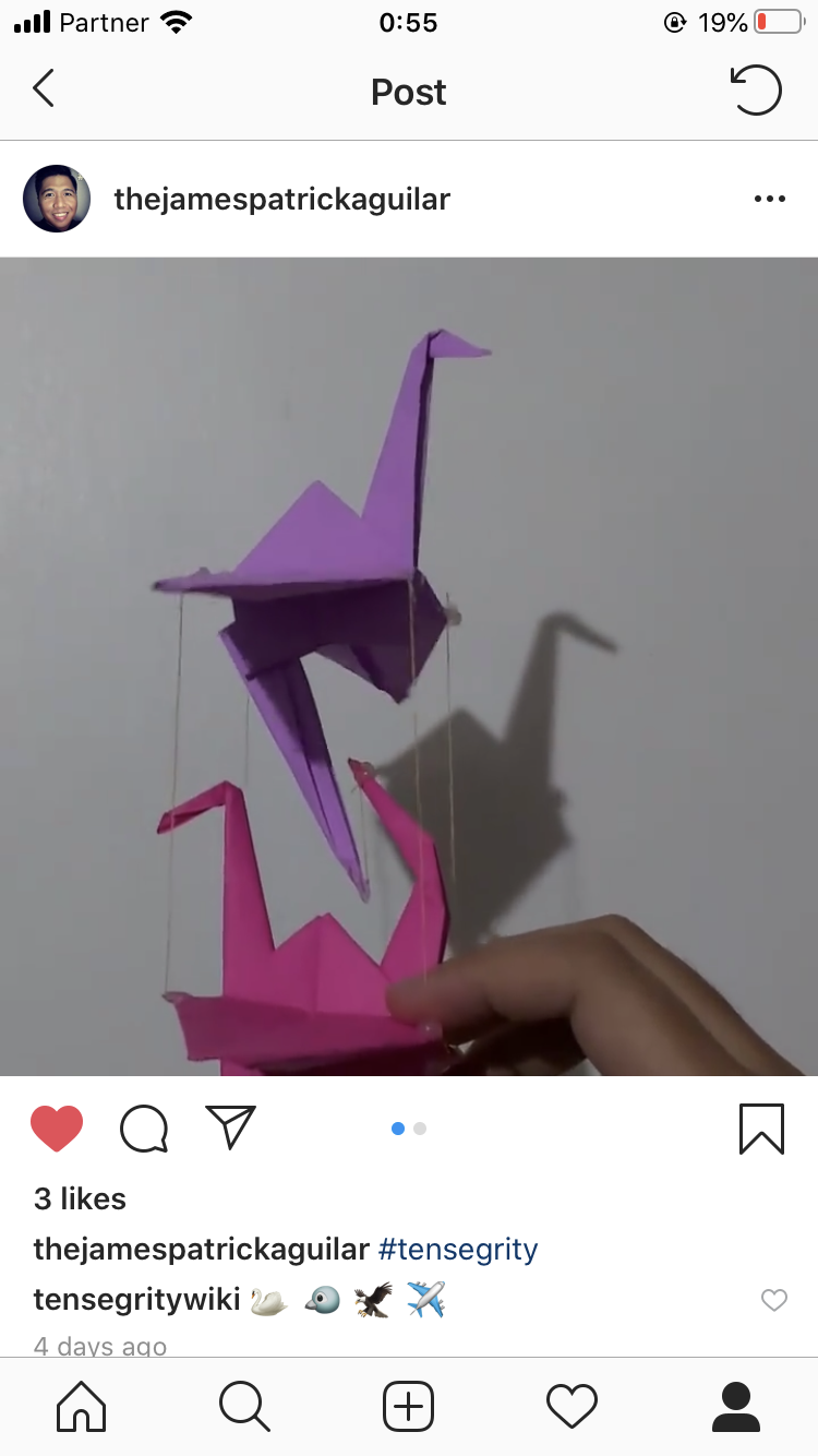 A tensegrity construction made during the 2020 COVID-19 quarantine period. The photo is a screenshot from instagram. The account is the first words of the filename, up to the hyphen, "-2020TensegrityChallenge". Example: my.account-2020TensegrityChallenge.PNG "my.account" is the name of the Instagram user's account where the photo was found.