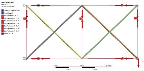 Ansys Workbench, a leading engineering simulation tool, can model tensegrity structures. Vitfc recently posted to an Ansys forum, "in order to study the efficency of tensegrity structures I am trying to write down the stiffness equations of such structures, to compare my equations with the answer of Finite Element Modelling software packages. I have done a really simply model in Ansys but I have some problems to model de behaviour of the cables in the structure. How can I model cables in Ansys Workbench? Should I choose the cables and change the properties of the material for anisotropic? or there is another way?" Below, a picture of the structure and the boundary conditions.