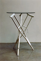Table supported by 3 strut tensegrity, the struts are crutches. By Tom Flemons"