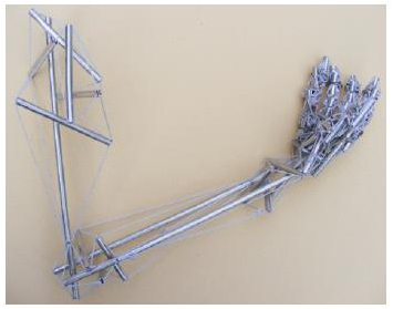 Right upper extremity modelled as a sequence of interconnecting icosahedral tensegrities with compression struts of different lengths. Model by Flemons.