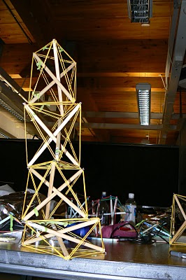 Tensegrity mast, 3 strut module x 4, by the Triangle Collective" http://thetrianglecollective.blogspot.com/2010/09/23082010-mid-semester-crit.html"