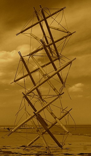 Di Carlo posted a photo of a 6 strut module repeated 3 times tensegrity mast, built by the seaside.
