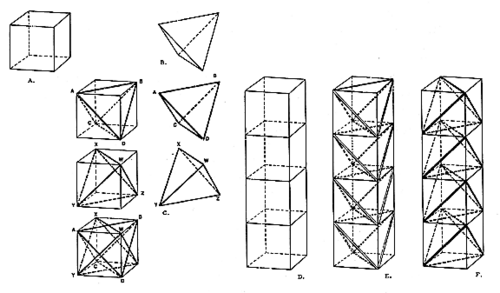 Fuller describes mast constructions as starting with a tetrahedron. He wrote in Synergetics, "Every cube has six faces (A). Every tetrahedron has six edges (B). Every cube has eight corners and every tetrahedron has four corners. Every cube contains two tetrahedra (ABCD and WXYZ) because each of its six faces has two diagonals, the positive and negative set. These may be called the symmetrically juxtaposed positive and negative tetrahedra whose centers of gravity are congruent with one another as well as congruent with the center of gravity of the cube (C). It is possible to stack cubes (D) into two columns. One column contains the positive tetrahedra (E) and the other contains the negative tetrahedra (F)." - Synergetics 730.11