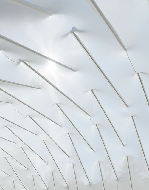 The MOOM Pavillion membrane contains 131 embedded struts. Photo by S. Hotta." link= "MOOM Pavillion"