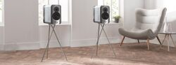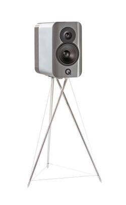 A single concept 300 speaker on its 3 strut tensegrity stand. See https://www.qacoustics.co.uk