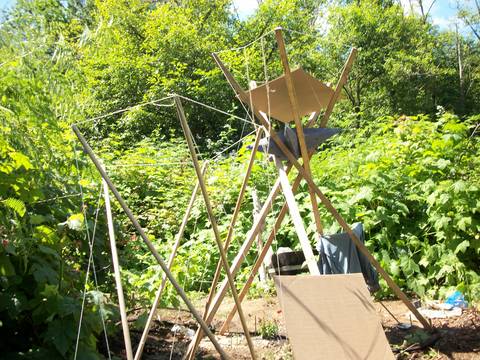 Armin R. Kachel posted to Synergeo July 22, 2010 a 3 strut classic prism tensegrity, made of 8' 2"x2" with 3 string side tendons and 2 2mm polyester side tendons, with a cardboard square inserted to cast shade.
