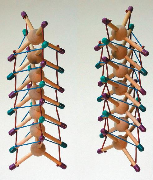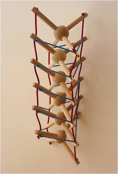 Flemons also models the spine as a type of tensegrity mast "first described and built by the artist Kenneth Snelson. This Vertebral Spiral Mast is composed of six compression spirals and six tension spirals. Half spiral clockwise; the other half spiral counter-clockwise. It suggests the agility of a snake or the fl exibility of a cat’s tail and can be tensioned to create S-curves that are common to both. This tensegrity mast demonstrates pure compression and tension. It is purely an analytical examination of the forces involved in a flexible load bearing mast."