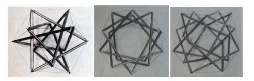Motro discusses Anthony Pugh's nucleated models. He wrote, "A first one comprised four triangular compressed components inside a net of tensile ones. The overall geometry was organized according to a cuboctahedron, one of the semi regular polyhedra. The second model was very surprising since the struts constituted a single circuit with 15 nodes and 15 compressed components. For this model, the cables are the edges of a polyhedron with two pentagonal bases. The third one is a twenty-strut four-layer circuit pattern system. There are represented on Figure 15. This presentation concerns only the second cell."