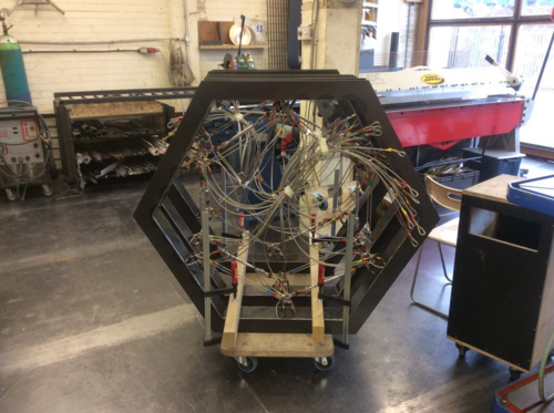 Tension, a tensegrity pavilion, hexagons arranged on a cart. Photo: StructureMode.