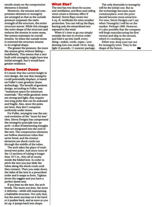 In the September 1998, popular mechanics published a two page preview of the Tensegrity I tent by Sierra.
