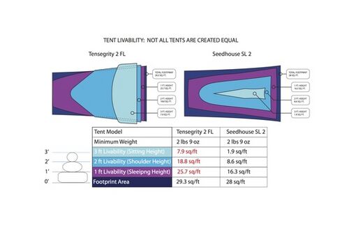 The Sierra Designs Tensegrity comes in a 1 Elite version (1lb, 10oz; 17.1 sq ft interior) and 2 Elite version (2lb, 2oz; 29.3 sq ft interior). The tents are also available in two beefier (Feather Light) versions featuring a 30D nylon ripstop floor, 20D polyester ripstop body, and seam taping throughout—the Tensegrity 1 FL (1lb, 15oz; 17.1 sq ft interior) and the Tensegrity 2 FL (2lb, 8oz; 29.3 sq ft interior). The FL build uses 30D floors and 20D Flys with a 1800mm (fly)/3000mm (floor) PU coatings, fully taped. The ELITE versions use 20D nylon impregnated with Silicone (1400mm (fly) /3000mm (floor) and are not taped. The ELITE tents do not meet CPAI-84 fire retardancy standards and will not be available in states that enforce that standard. They also require user seam sealing. But they also have 4 times the tear resistance, dramatically improved UV resistance, and by eliminating urethane and the associated toxic FR chemicals, they eliminate the main fabric failure point and will truly last a lifetime with normal care.