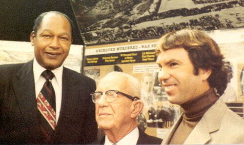 Image above is from left to right, Mayor of Los Angeles, Tom Bradley, Buckminster Fuller, and John Warren. This image was taken by George Fisher during the dedication of the Los Angeles Bicentennial Information Center at Pershing Square. A graphic timeline created by Richard Saul Wurman illustrating the history of Los Angeles is in the background. The display is sheltered under Buckminster Fuller's Fly's Eye dome (based loosely on Fuller's Patent, https://patents.google.com/patent/US3197927 not on geodesic math, Buckminster Fuller's Patent 3,197,927 is the origin of the Fly's Eye Dome design, circa 1961 and before.).
